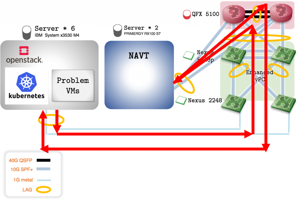 LACPのハッシュアルゴリズムの偏りによって、 1 Gbps * 2 を出せるサーバが確率的に 1 Gbps しか出てないことがあり、15台のVM同士の通信では 8 Gbps までしか実験を行うことができませんでした。右下の Traffic of servertransmit traffics of servers のグラフからOpenstackのVM同士の合計トラフィックが 8 Gbps しか出てないことがわかります。今回のバックボーンのキャパシティは 20 Gbps であったため、今回のベンチマークはバックボーンのベンチマークというよりサーバのベンチマークになってしまいました。特に左下の CPU idle のグラフでは各ホストのcpu0の idle が大幅に下回っており、サーバで 10 Gbps を処理をする際割り込みが多く発生することが大変であるという意味がわかりました。