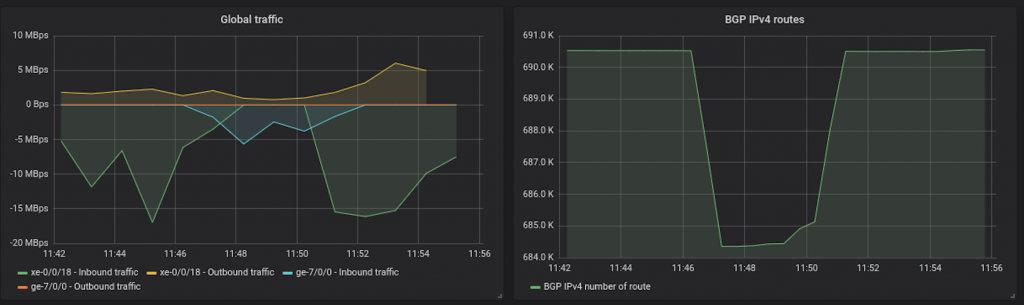 以上の障害発生時のメトリクスを見ても、障害発生時間帯にルート数が5000経路ほど減少していました。また、こちらの設定ミスか上流からのトラフィックを受信しているのに、こちらからトラフィックが流れていませんでした。障害発生から5分以内にメトリクスを把握し上流であるHomeNOC様に確認したところ、一部障害が発生していたとお聞きしました。