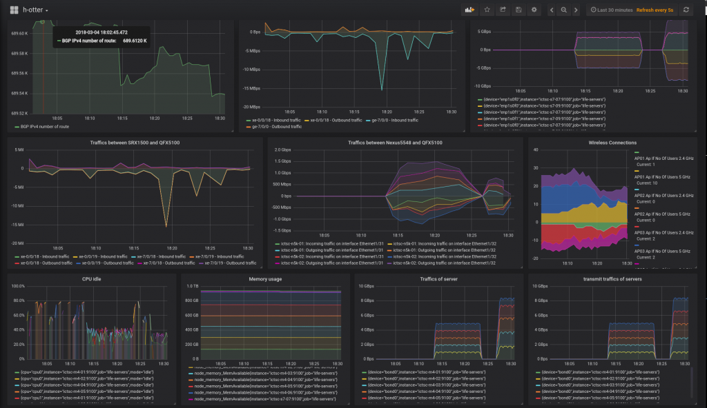 わかりにくいですが、18:13ごろから18:23ごろまで 5 Gbps 、 18:28以降は 8 Gbps の流量が出ていることが右下のTraffic of servertransmit traffics of servers のグラフからわかります。このグラフは、Openstackのホストサーバの受信と送信の流量を示しています。