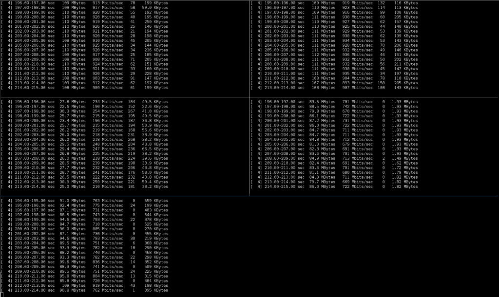その後、18:28以降に同様の経路でOpenstackのVM 15台から、別のVM 15台までiperf3を実行していました。