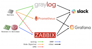 今回は前回・前々回大会の電源トラブルの反省を元に、監視基盤をさくらのクラウド上のサーバに構築し、会場とVPNを貼ることで監視を行いました。