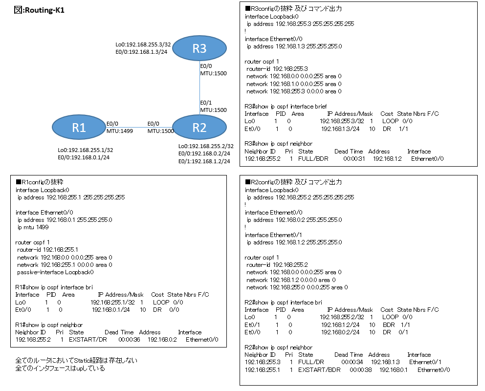 - このネットワークはR1, R2間のOSPFがMTU mismatchでOSPFのneighbor関係を確立されていない以外は正常な設定です。
