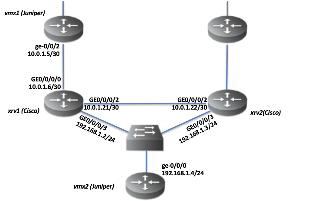 - D: vmx1とxrv1の間のvlan設定が間違っている